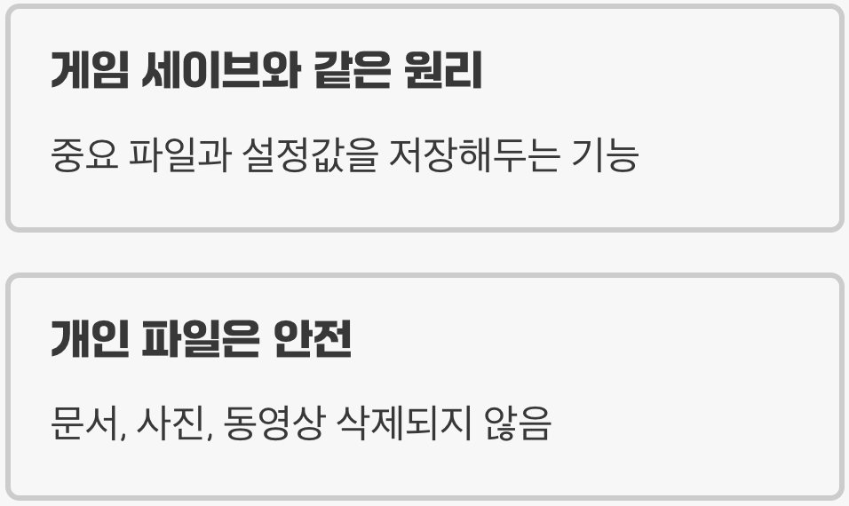가장 중요한 점은 이 과정에서 여러분이 저장한 문서, 사진, 동영상과 같은 개인 파일은 전혀 삭제되지 않는다는 것입니다. 오직 윈도우 시스템 파일, 설치된 프로그램, 드라이버, 레지스트리와 같은 시스템의 뼈대에만 영향을 줍니다. 따라서 데이터 유실 걱정 없이 안심하고 사용할 수 있는 첫 번째 문제 해결 단계가 될 수 있습니다.