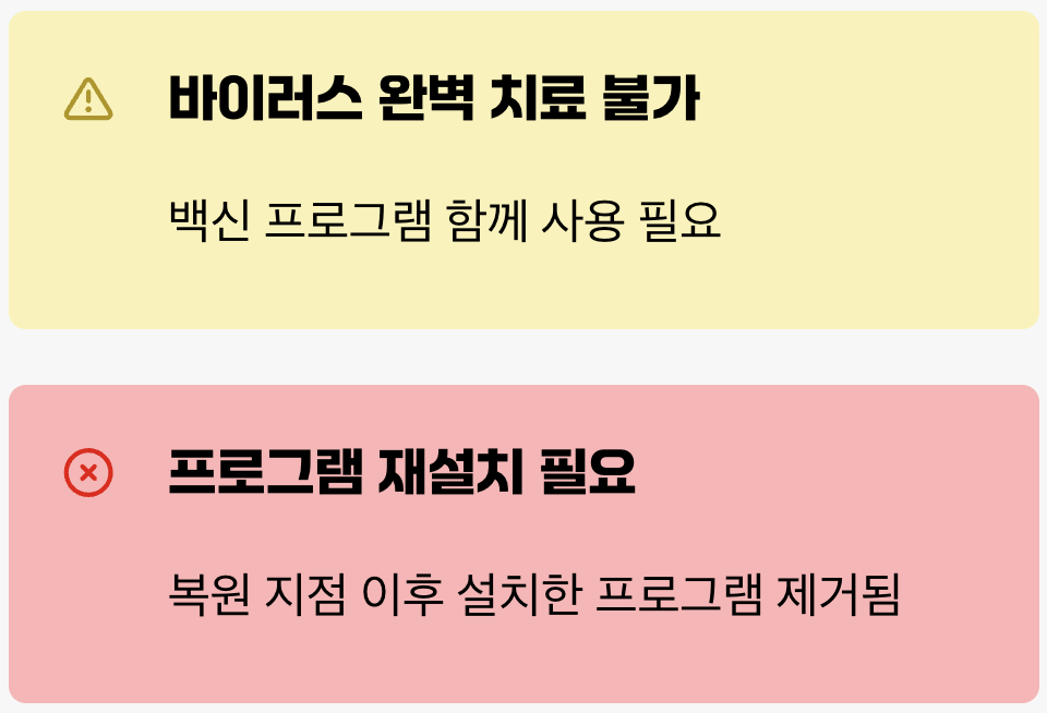 매우 유용한 기능이지만, 몇 가지 알아두어야 할 점이 있습니다. 우선, 이 기능은 바이러스나 악성코드를 완벽하게 치료하지는 못합니다. 물론 악성코드로 인해 변조된 시스템 설정을 되돌릴 수는 있지만, 감염된 파일 자체를 삭제하는 것은 아니므로 반드시 백신 프로그램을 함께 사용해야 합니다.
