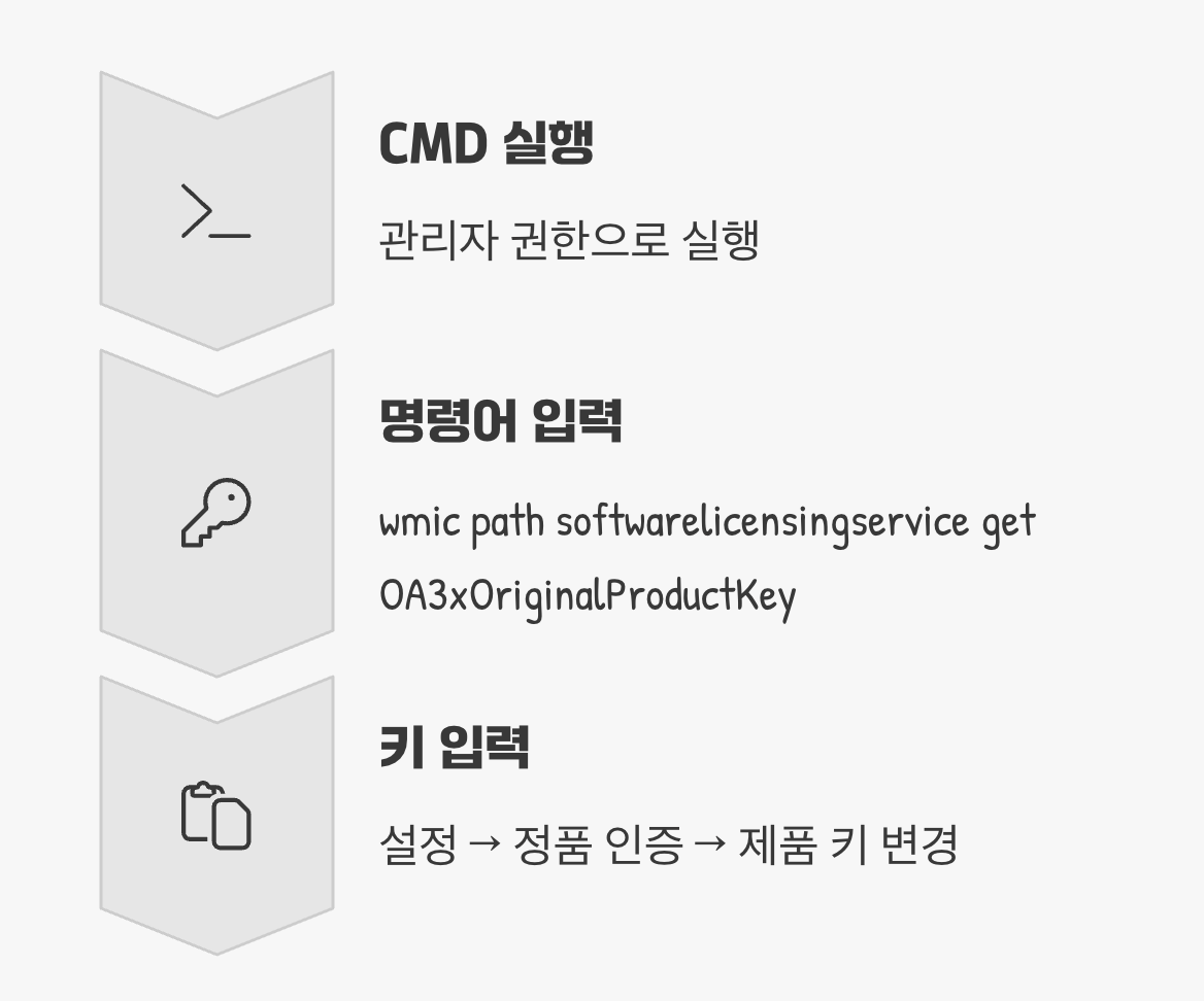 '문제 해결사'로도 해결되지 않는다면, 내 컴퓨터에 숨겨진 윈도우 제품 키(Product Key)를 직접 찾아서 다시 입력해 보는 방법을 시도할 수 있습니다. 특히 처음부터 윈도우가 설치되어 있던 브랜드 PC(삼성, LG 등)를 구매한 경우, 제품 키가 메인보드에 저장되어 있는 경우가 많습니다.