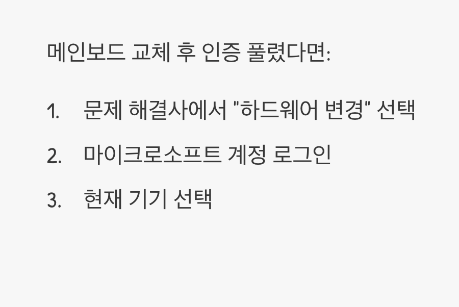 만약 최근에 메인보드 같은 주요 부품을 교체했다면, '문제 해결사'가 실행된 후 나타나는 선택지에서 "최근에 이 디바이스의 하드웨어를 변경했습니다"라는 항목을 선택해야 합니다. 이는 마치 이사한 뒤, 새 주소를 알려주는 것과 같은 과정입니다.