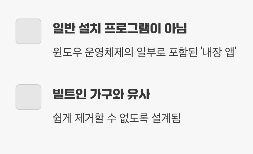 우리가 일반적으로 프로그램을 지울 때 사용하는 '설정 > 앱' 메뉴에 들어가 봐도, 이런 기본 앱들은 제거 버튼이 비활성화되어 있거나 아예 목록에 보이지 않는 경우가 많습니다. 그 이유는 이 앱들이 일반적인 설치 프로그램이 아니라, 윈도우 운영체제의 일부로 포함된 ‘내장 앱(Built-in App)’이기 때문입니다.