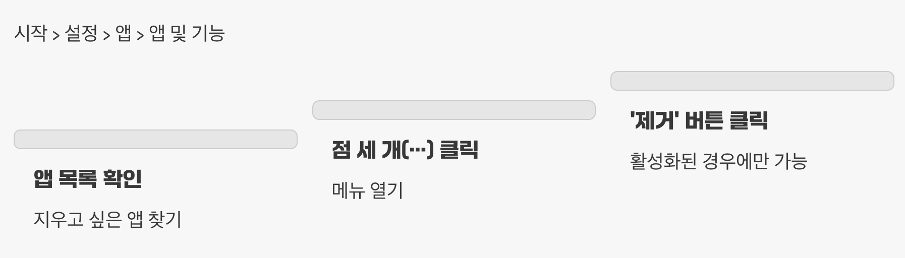 [시작 버튼 > 설정 > 앱 > 앱 및 기능(또는 설치된 앱)] 메뉴로 들어가 목록을 살펴보세요. 지우고 싶은 앱 오른쪽에 있는 점 세 개(···) 메뉴를 클릭했을 때 ‘제거’ 버튼이 활성화되어 있다면, 주저 없이 클릭하여 삭제해 주면 됩니다. 날씨, 스티커 메모, 그림판 3D 같은 앱들이 여기에 해당할 수 있습니다.