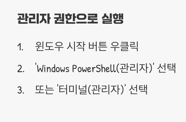 가장 중요한 첫 단계는 파워셸을 ‘관리자 권한’으로 실행하는 것입니다. 윈도우 시작 버튼에 마우스 오른쪽 버튼을 클릭하고 메뉴에서 ‘Windows PowerShell(관리자)’ 또는 **‘터미널(관리자)’**을 선택하세요. 파란색이나 검은색의 명령창이 나타나면 모든 준비가 끝난 것입니다.