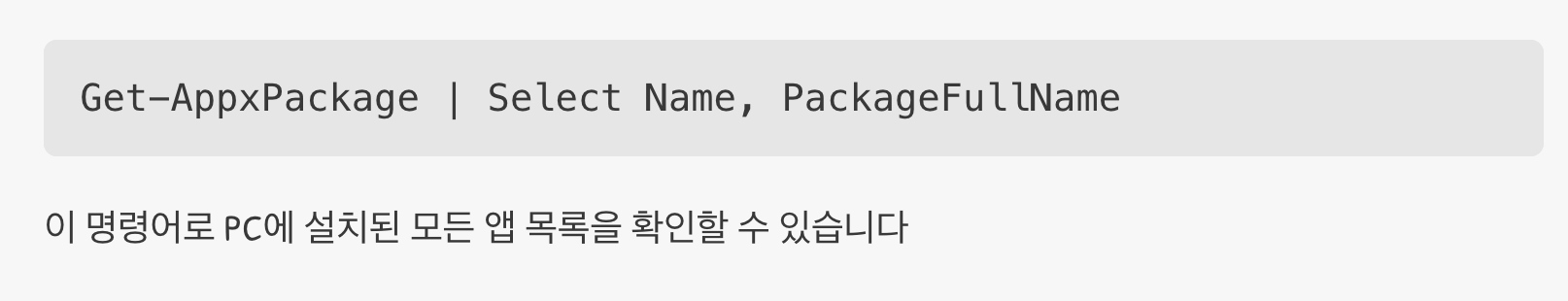 이제 본격적으로 앱을 삭제해 보겠습니다. 먼저 내 PC에 어떤 앱이 설치되어 있는지 전체 목록을 확인하여, 지우고 싶은 앱의 정확한 이름을 알아내야 합니다. 아래의 명령어를 복사하여 파워셸 창에 붙여넣고 엔터를 누르세요.