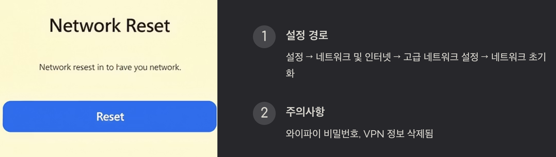 [시작 버튼 > 설정 > 네트워크 및 인터넷 > 고급 네트워크 설정] 순서로 들어간 뒤, ‘네트워크 초기화’를 클릭하고 ‘지금 다시 설정’ 버튼을 누르면 됩니다. 다만 이 방법을 사용하면 저장해 두었던 모든 와이파이 비밀번호와 VPN 연결 정보 등이 삭제되므로, 미리 중요한 비밀번호는 따로 적어두는 것이 좋습니다. 초기화 후 PC가 재부팅되면, 다시 와이파이 비밀번호를 입력하여 접속을 시도해 보세요.