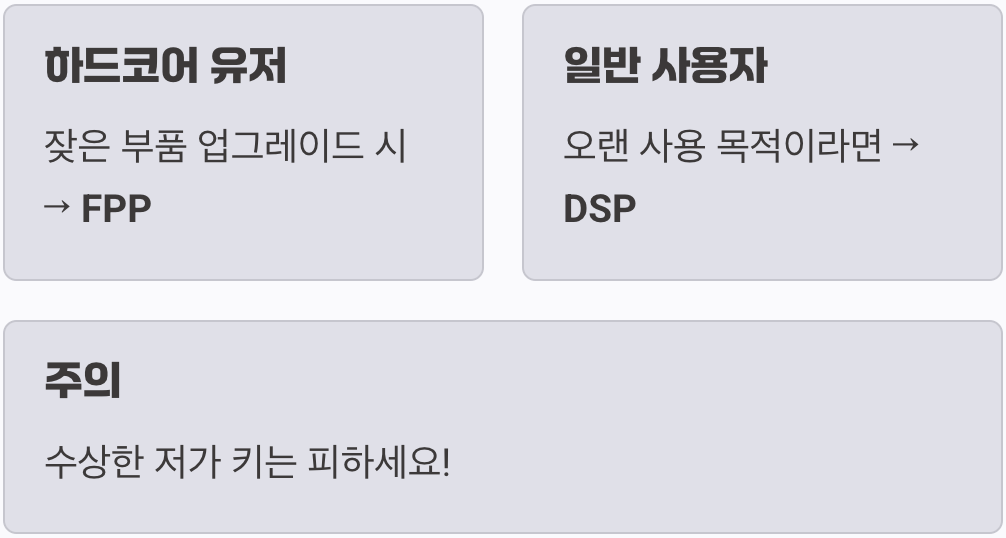 만약 당신이 컴퓨터 하드웨어에 관심이 많아 주기적으로 메인보드를 포함한 핵심 부품을 업그레이드하는 '하드코어 유저'라면, 비싸더라도 'FPP'가 유일한 정답입니다. 반면, 한번 컴퓨터를 조립하면 고장 날 때까지 큰 부품 교체 없이 오랫동안 사용하는 '일반적인 사용자'라면, 합리적인 가격의 'DSP'가 훌륭한 선택이 될 수 있습니다. 그리고 인터넷에서 파는 수상할 정도로 저렴한 키는, 미래의 골칫거리를 미리 사는 것과 같으니 반드시 피하는 것이 상책입니다.