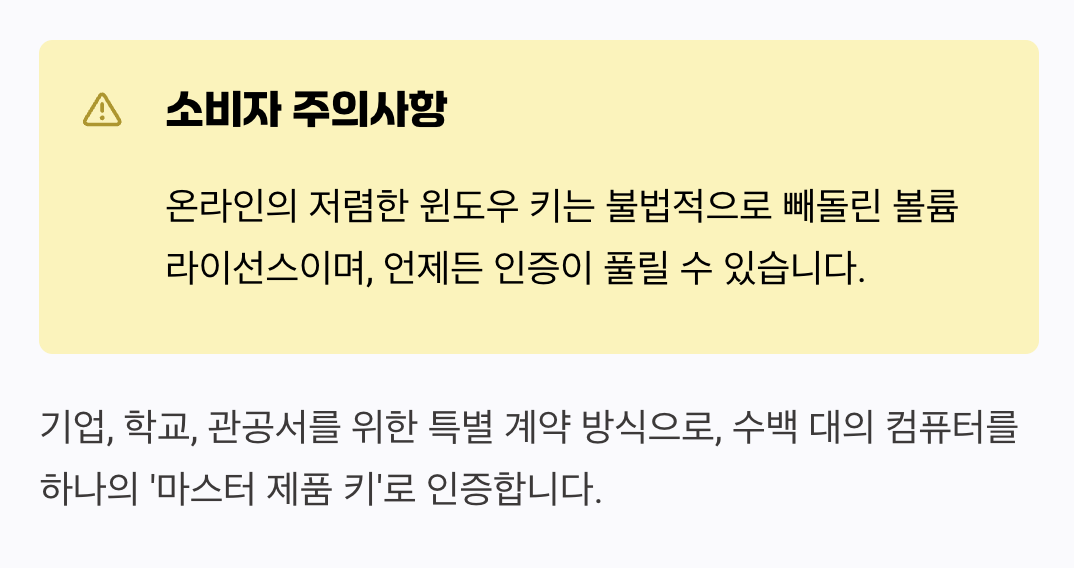 여기서 일반 소비자가 반드시 알아야 할 함정이 있습니다. 온라인에서 터무니없이 저렴한 가격(몇천 원~몇만 원)에 판매되는 윈도우 키는 대부분 이 기업용 볼륨 라이선스의 일부를 불법적으로 빼돌려 판매하는 것입니다. 당장은 인증이 될지 몰라도, 원래의 계약 기업이 라이선스 관리를 변경하거나 마이크로소프트의 단속에 걸리면 어느 날 갑자기 인증이 풀려버리는 시한폭탄과도 같습니다.