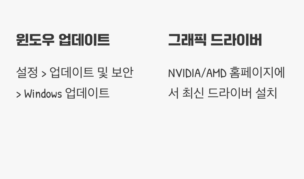 가장 확실한 해결 방법은 윈도우를 최신 상태로 유지하는 것입니다. ‘설정 > 업데이트 및 보안 > Windows 업데이트’ 메뉴에서 현재 사용 가능한 모든 업데이트를 설치해주세요. 또한, 그래픽 카드의 역할이 중요한 게임 등에서 오류가 발생한다면, 엔비디아(NVIDIA)나 AMD 홈페이지에 방문해 자신의 그래픽 카드에 맞는 최신 드라이버를 직접 설치하는 것도 중요합니다.