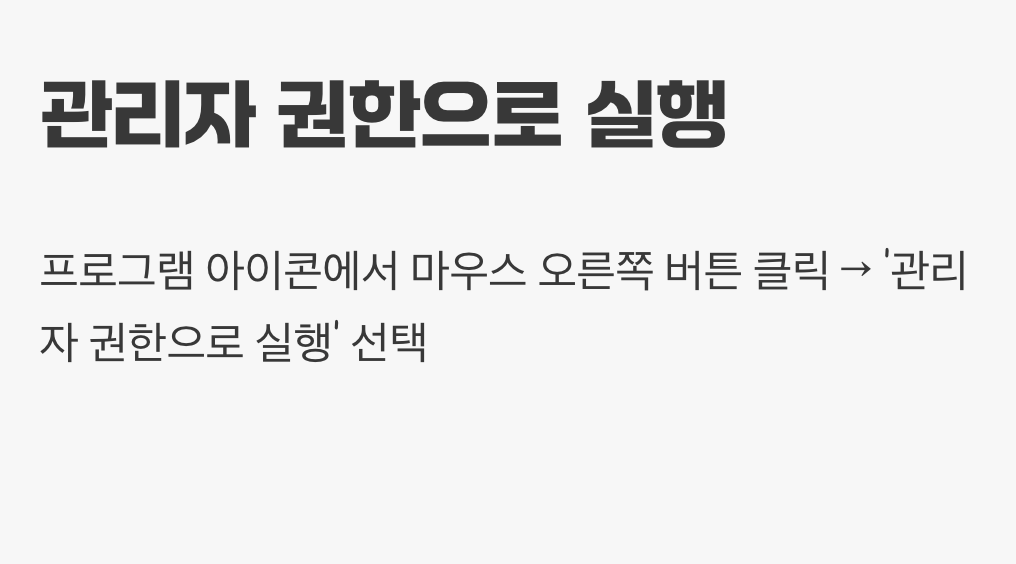 복잡한 방법을 시도하기 전에, 가장 쉽고 빠르게 시도해볼 수 있는 방법이 있습니다. 바로 해당 프로그램을 ‘관리자 권한’으로 실행해보는 것입니다. 일부 프로그램은 시스템의 중요한 파일에 접근해야 하는데, 일반 사용자 권한으로는 이 접근이 막혀 오류가 발생하기도 합니다.