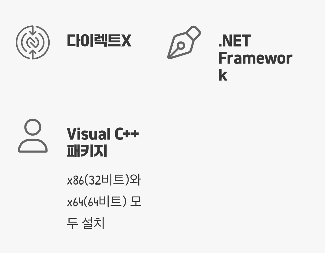 이 문제의 핵심 용의자는 크게 세 가지입니다. 바로 ‘다이렉트X(DirectX)’, ‘.NET Framework’, 그리고 ‘Microsoft Visual C++ 재배포 가능 패키지’ 입니다. 마이크로소프트 공식 홈페이지에서 이 세 가지의 최신 버전을 모두 다운로드하여 설치해주세요. 특히 Visual C++ 패키지는 x86(32비트용)과 x64(64비트용) 버전을 모두 설치하는 것이 문제 해결의 가장 중요한 핵심입니다.