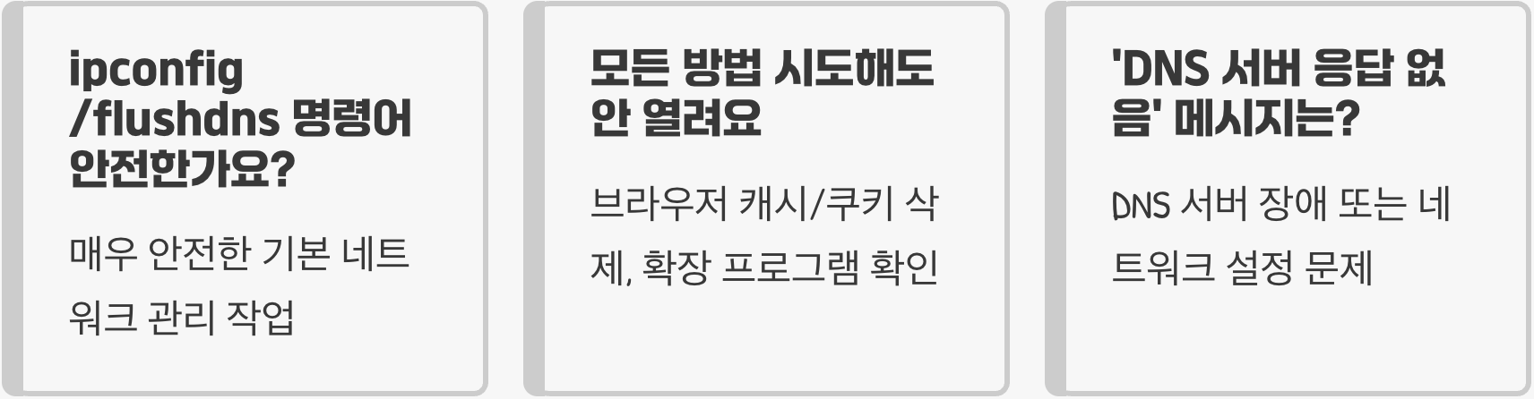DNS 캐시를 비우는 작업은 전혀 어렵지 않으며, 컴퓨터에 어떠한 악영향도 주지 않는 안전한 방법입니다. 아래 순서대로 따라 하면 누구든 쉽게 낡은 주소 정보를 초기화할 수 있습니다.