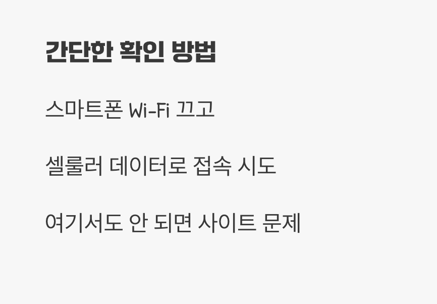 모든 방법을 시도하기 전에 가장 먼저 확인해 볼 간단한 방법이 있습니다. 바로 문제가 나에게만 있는지, 아니면 사이트 자체에 문제가 생긴 것인지 확인하는 것입니다. 가장 쉬운 방법은 스마트폰의 Wi-Fi를 끄고, 셀룰러 데이터(LTE/5G) 상태에서 문제가 되는 사이트에 접속해 보는 것입니다.