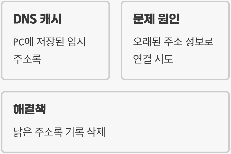 이 문제를 일으키는 주범의 정식 명칭은 'DNS 캐시(DNS Cache)'입니다. 앞서 설명한 '임시 주소록'이 바로 이것입니다. 다른 모든 사이트는 정상적으로 접속되는데 특정 사이트 한두 곳만 접속이 안 된다면, 90% 이상은 이 DNS 캐시에 저장된 낡은 정보 때문입니다.