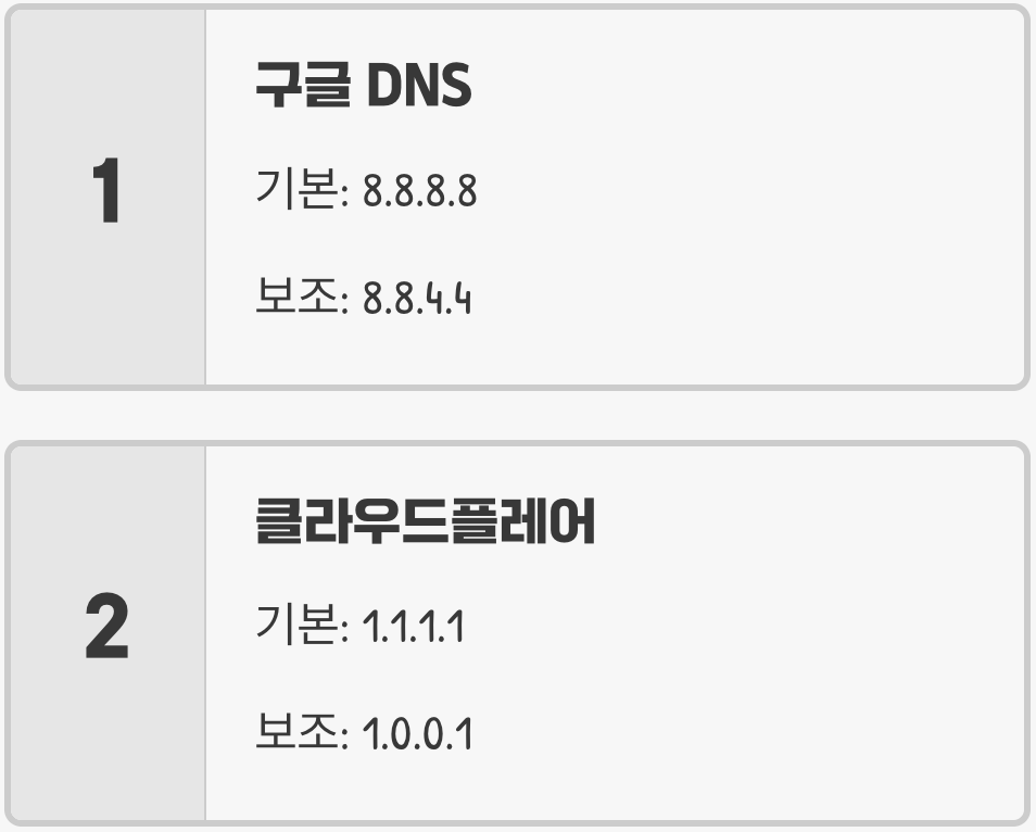 대표적인 공용 DNS로는 구글 DNS(기본: 8.8.8.8, 보조: 8.8.4.4)나 클라우드플레어 DNS(기본: 1.1.1.1, 보조: 1.0.0.1)가 있습니다. 제어판의 '네트워크 및 공유 센터'에서 현재 연결된 네트워크의 '속성'으로 들어가 '인터넷 프로토콜 버전 4(TCP/IPv4)' 설정에서 이 주소들을 직접 입력해 주면 됩니다. 이 방법은 인터넷 속도 개선에도 약간의 도움을 줄 수 있습니다.