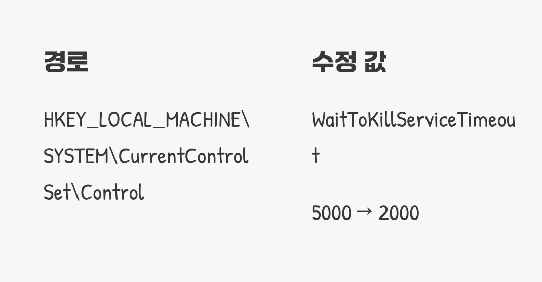 레지스트리 편집기에서 HKEY_LOCAL_MACHINE\SYSTEM\CurrentControlSet\Control 경로로 이동하세요. 오른쪽 창에서 WaitToKillServiceTimeout이라는 값을 찾아 더블클릭합니다. 기본값인 5000(5초)을 2000(2초) 정도로 수정하면, PC가 불필요하게 기다리는 시간을 줄여 훨씬 빠르게 종료됩니다.