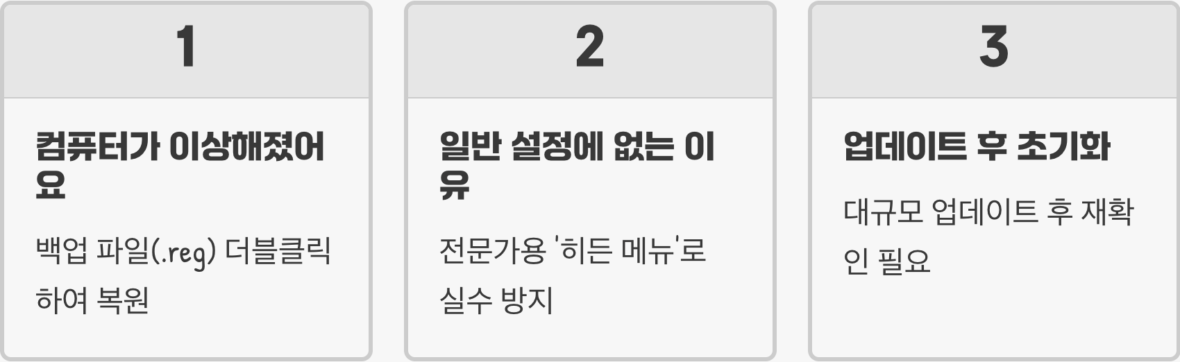 A. 이럴 때를 대비해 가장 먼저 '백업'을 하는 것입니다. 만약 백업을 해두었다면, 저장해 둔 백업 파일(.reg)을 더블클릭하여 병합하면 수정 이전의 상태로 안전하게 돌아갈 수 있습니다.