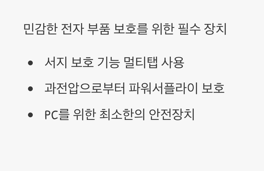 민감한 전자 부품으로 이루어진 PC는 불안정한 전력 공급에 매우 취약합니다. 특히 천둥 번개가 치거나, 정전이 발생하거나, 주변에서 전력 소모가 큰 가전제품을 사용할 때 발생하는 순간적인 과전압(서지)은 PC의 파워 서플라이나 메인보드에 치명적인 손상을 입힐 수 있습니다.