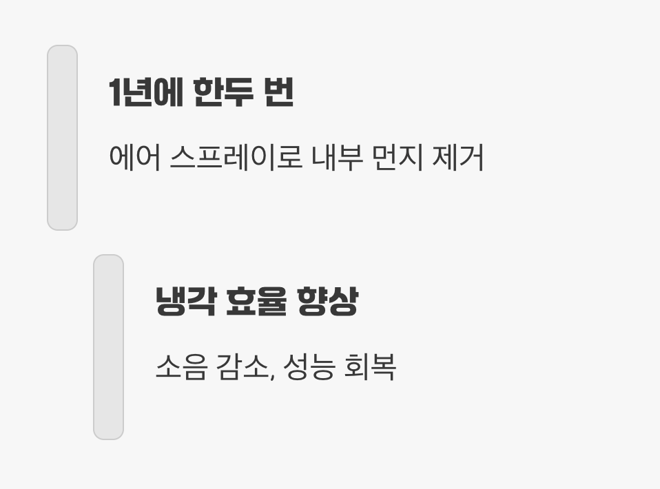 A. 사용 환경에 따라 다르지만, 일반적으로는 1년에 한 번 정도가 적당합니다. 만약 반려동물을 키우시거나, 창문을 자주 열어두는 환경이라면 6개월에 한 번씩 점검하고 청소해 주는 것이 좋습니다.