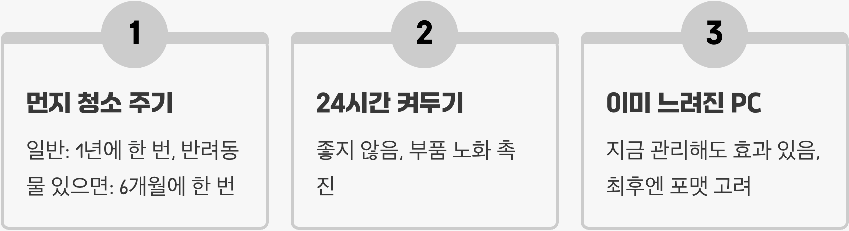 정기적인 먼지 청소, 온도 관리, 소프트웨어 업데이트, 데이터 백업, 안티바이러스 사용, 전원 관리, 불필요한 소프트웨어 설치 금지 등 기본이지만 효과적인 7가지 PC 수명 연장 습관이 자세히 정리되어 있습니다. - 컴퓨터 수명 늘리는 관리 방법: 조립 PC와 브랜드 PC 공통