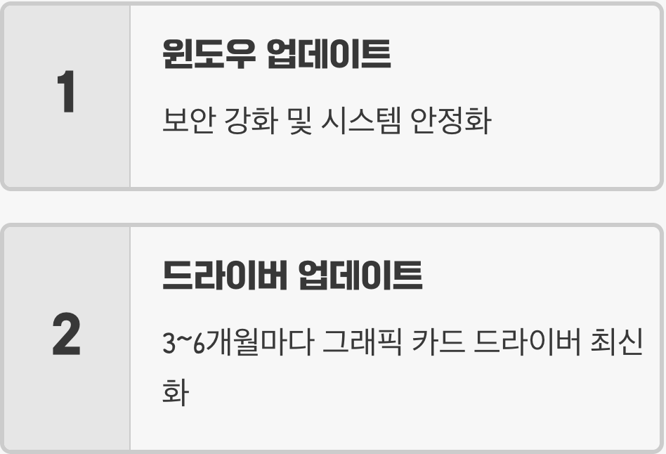 귀찮더라도 윈도우 업데이트는 가급적 최신 상태로 유지하고, 특히 그래픽 카드 드라이버는 3~6개월에 한 번씩 제조사 홈페이지를 통해 최신 버전으로 업데이트해 주는 것이 좋습니다. 이는 PC를 더 안전하고 쾌적하게 사용하는 가장 기본적인 관리법입니다.
