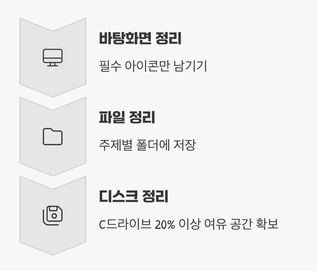 바탕화면은 꼭 필요한 몇 개의 아이콘만 남기고, 파일들은 D드라이브 등에 주제별 폴더를 만들어 깔끔하게 정리하는 '바탕화면 다이어트'를 실천해 보세요. 또한, 윈도우가 설치된 C드라이브의 여유 공간이 20% 미만으로 떨어지면 시스템 속도가 급격히 저하될 수 있으므로, 주기적으로 '디스크 정리' 기능을 활용해 불필요한 임시 파일들을 지워주는 것이 좋습니다.