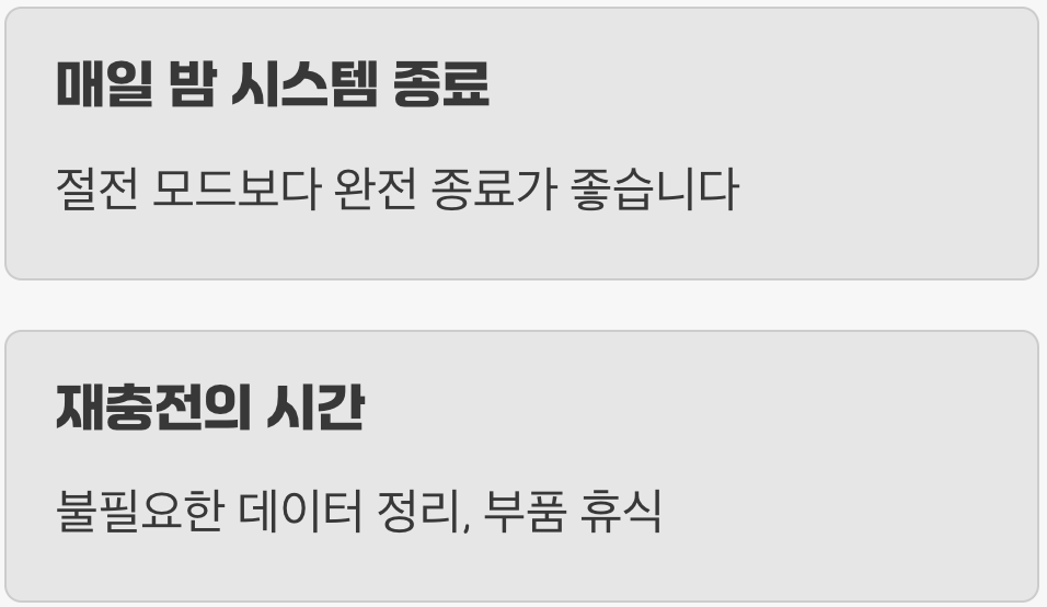 잠깐 자리를 비울 때 사용하는 '절전 모드'는 편리하지만, PC의 메모리에 작업 내용이 그대로 남아있어 완전한 휴식 상태는 아닙니다. 하루의 작업을 모두 마쳤다면, 절전 모드 대신 '시스템 종료'를 통해 PC의 하루를 깨끗하게 마무리해 주는 것이 장기적인 안정성에 훨씬 더 이롭습니다.