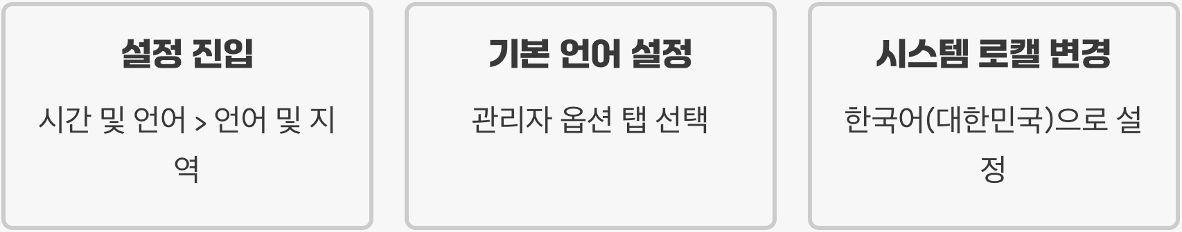 설정 방법은 간단합니다. 윈도우 '설정'에 들어가 '시간 및 언어' > '언어 및 지역' 메뉴를 선택하세요. 그 다음 화면 우측에 있는 '기본 언어 설정'을 클릭합니다. '국가 또는 지역' 창이 나타나면 '관리자 옵션' 탭을 누르고, '유니코드를 지원하지 않는 프로그램을 위한 언어' 섹션에서 '시스템 로캘 변경' 버튼을 클릭하여 '한국어(대한민국)'로 설정한 뒤 확인을 누르면 됩니다.