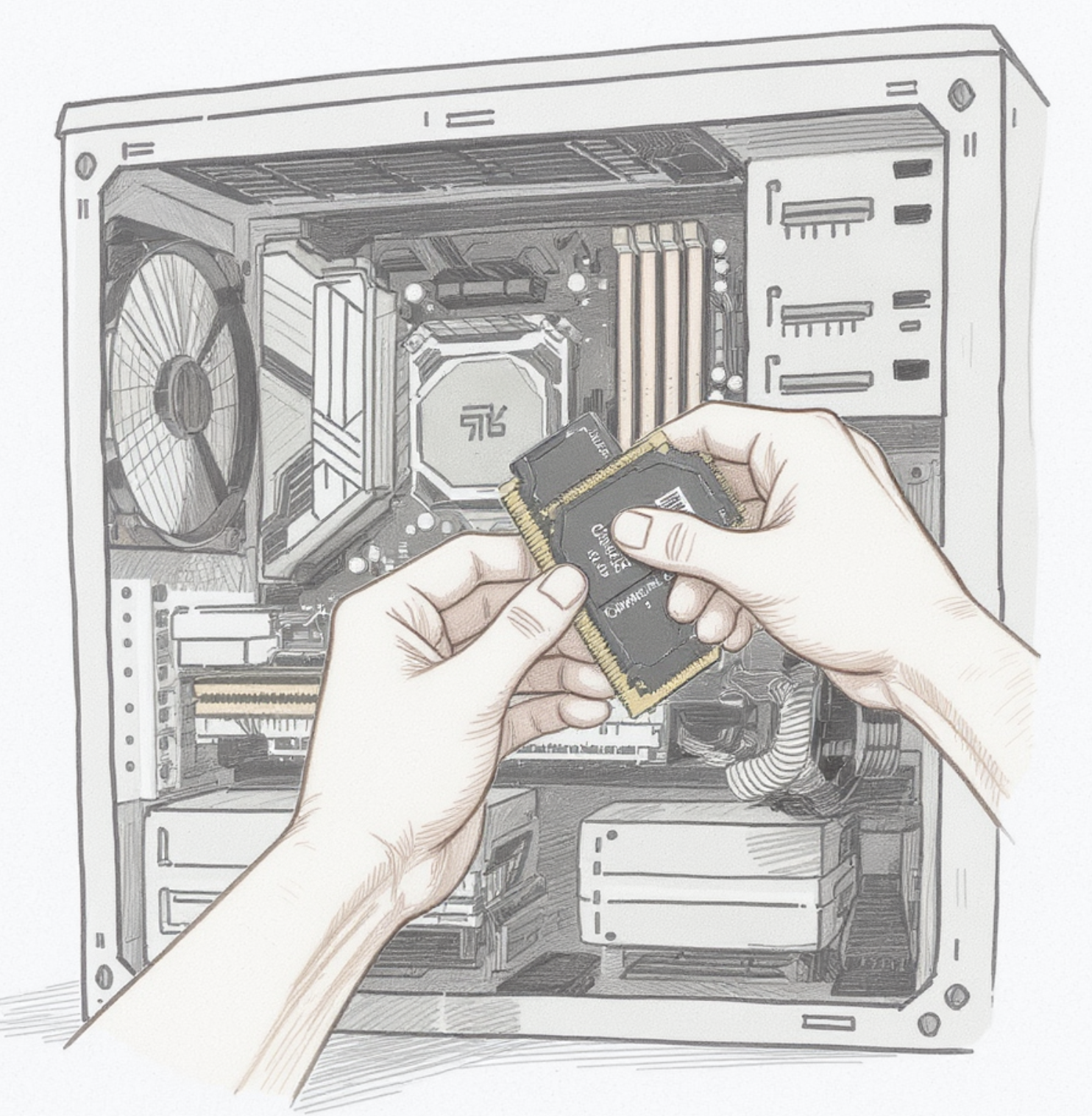 컴퓨터 전원을 완전히 끄고 전원 코드까지 뽑은 상태에서, 본체 옆면을 열어 메인보드에 길게 꽂혀 있는 메모리를 조심스럽게 뺐다가 다시 '딸깍' 소리가 나도록 꽂아보세요. 이 간단한 '메모리 재장착'만으로도 허무하게 문제가 해결되는 경우가 생각보다 많습니다.