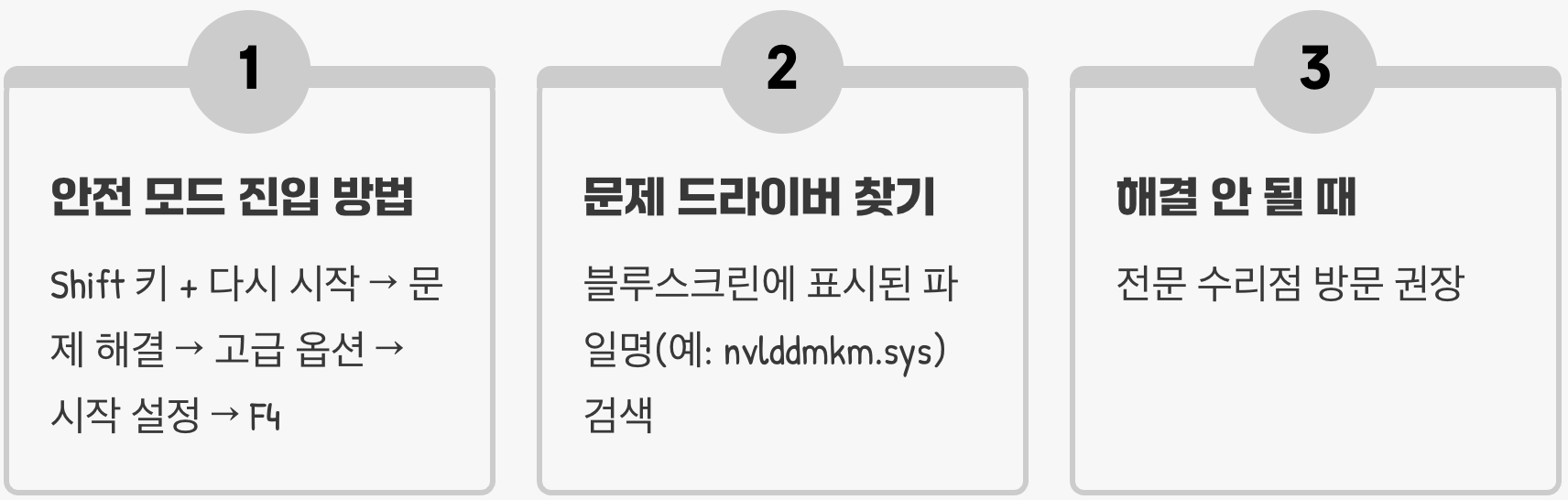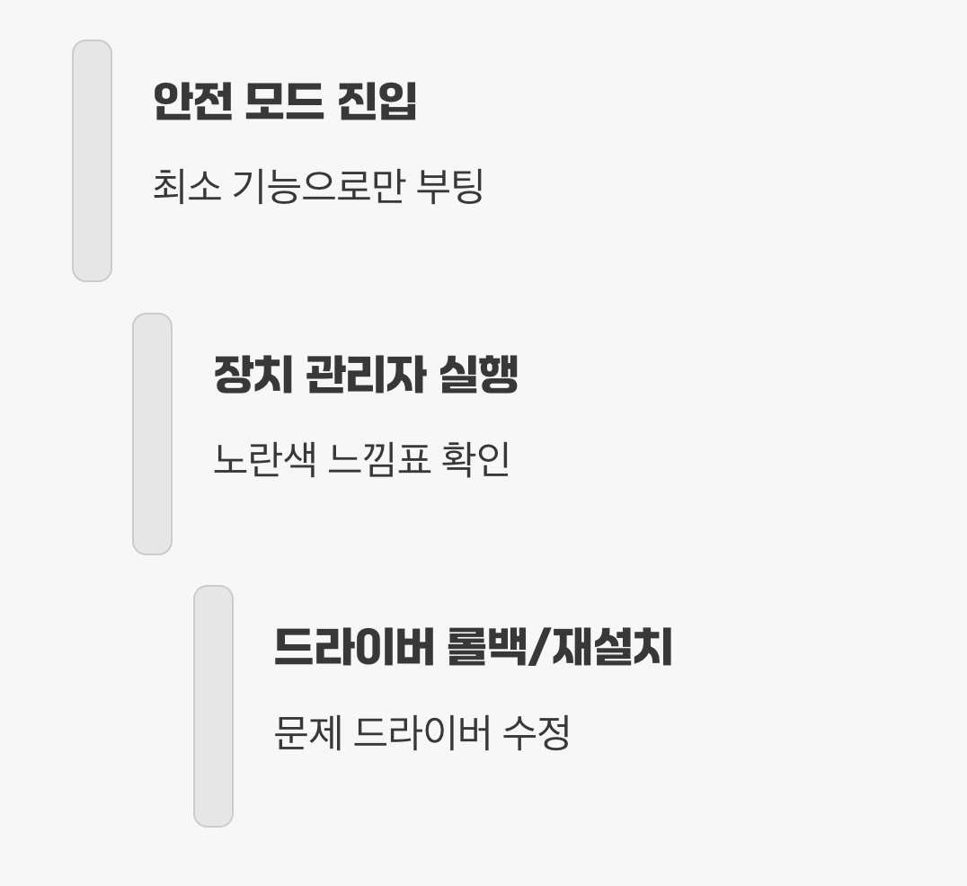 원인이 명확하니 해결 방법도 간단합니다. 문제를 일으킨 드라이버를 찾아 이전 버전으로 되돌리거나, 재설치해주면 대부분의 문제가 해결됩니다. 하지만 정상적으로 부팅이 안 되는 상황에서는 이 작업이 불가능하므로, 컴퓨터를 최소한의 기능으로만 부팅하는 '안전 모드'로 진입해야 합니다.