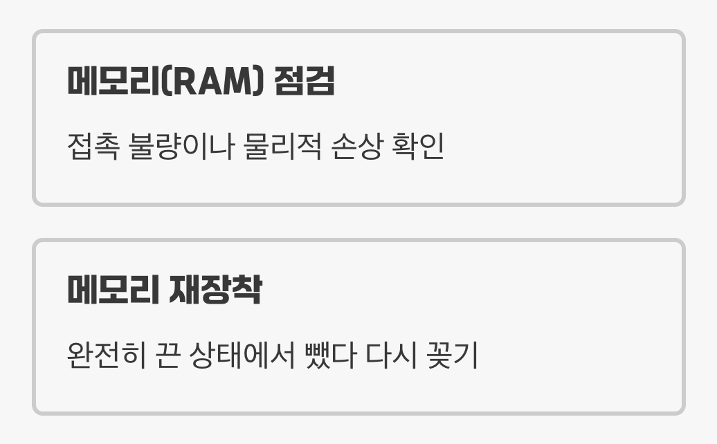 소프트웨어적인 조치를 모두 취했는데도 문제가 해결되지 않는다면, 아주 드물게 하드웨어 자체의 문제일 수 있습니다. 이 오류와 가장 관련이 깊은 하드웨어는 컴퓨터의 작업 책상 역할을 하는 '메모리(RAM)'입니다. 메모리 접촉 불량이나 물리적인 손상이 원인이 되기도 합니다.