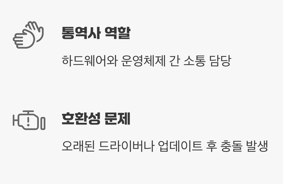 그렇다면 규칙을 어긴 범인은 대체 누구일까요? 앞서 말했듯, 이 문제의 90% 이상은 바로 '드라이버(Driver)'라고 불리는 작은 프로그램 때문입니다. 드라이버는 그래픽카드, 사운드카드, 랜카드 같은 컴퓨터 부품(하드웨어)과 운영체제(윈도우)가 서로 대화할 수 있도록 돕는 통역사 역할을 합니다.