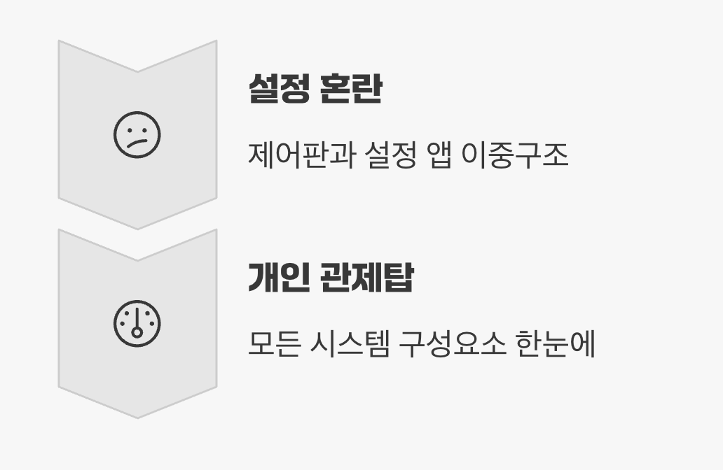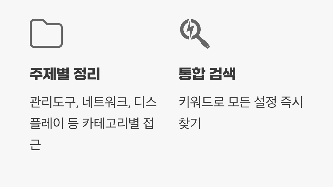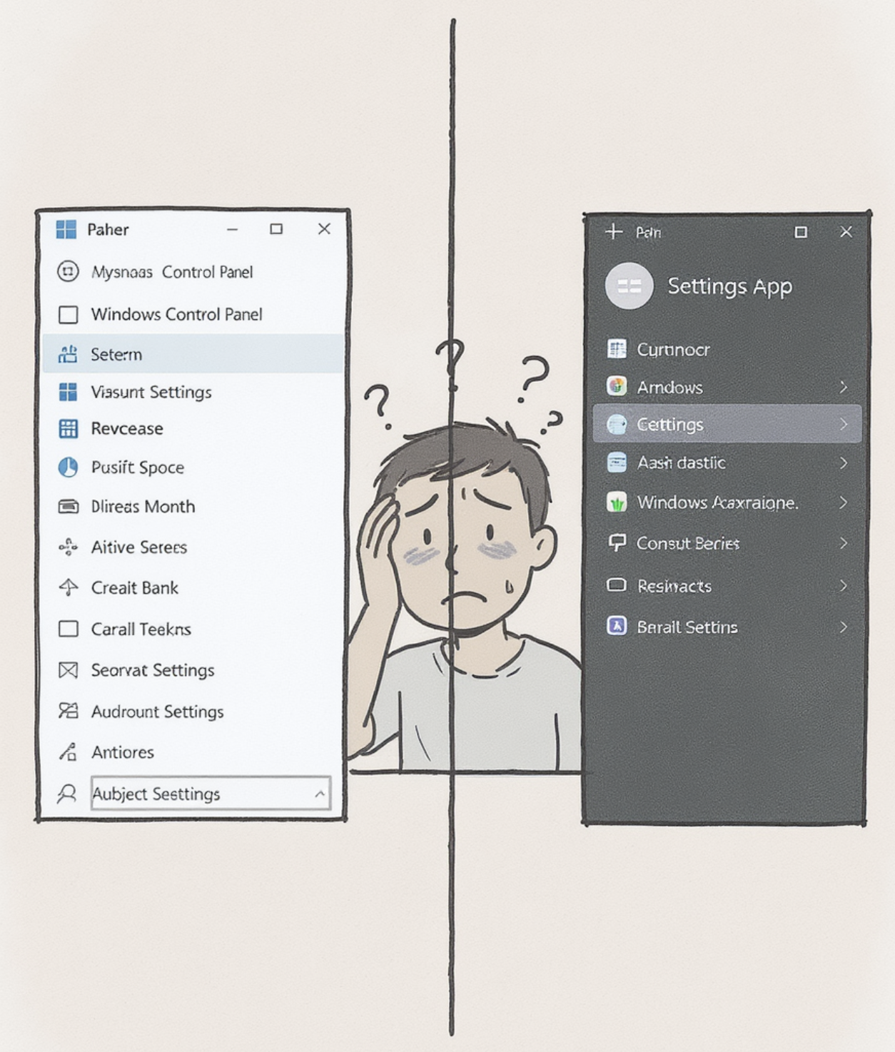 최신 윈도우는 기존의 '제어판'과 새로운 '설정' 앱, 두 가지의 설정 메뉴가 공존하여 사용자를 혼란스럽게 만듭니다. 어떤 기능은 제어판에만 있고, 또 다른 기능은 설정 앱에만 있어 일관성이 떨어지죠. 이 때문에 간단한 옵션 하나를 변경하기 위해 이곳저곳을 헤매는 불편함이 발생합니다.