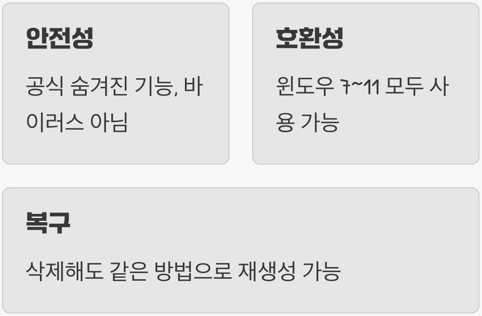 '갓모드'는 윈도우 시스템 파일을 변경하거나 숨겨진 권한을 부여하는 해킹 도구가 아닙니다. 단지 기존에 있던 설정 항목들을 한곳에 모아 보여주는 '바로가기 모음'일 뿐입니다. 따라서 이 기능을 활성화한다고 해서 컴퓨터가 느려지거나 보안에 문제가 생길 위험은 전혀 없으니 안심하고 사용하셔도 됩니다.