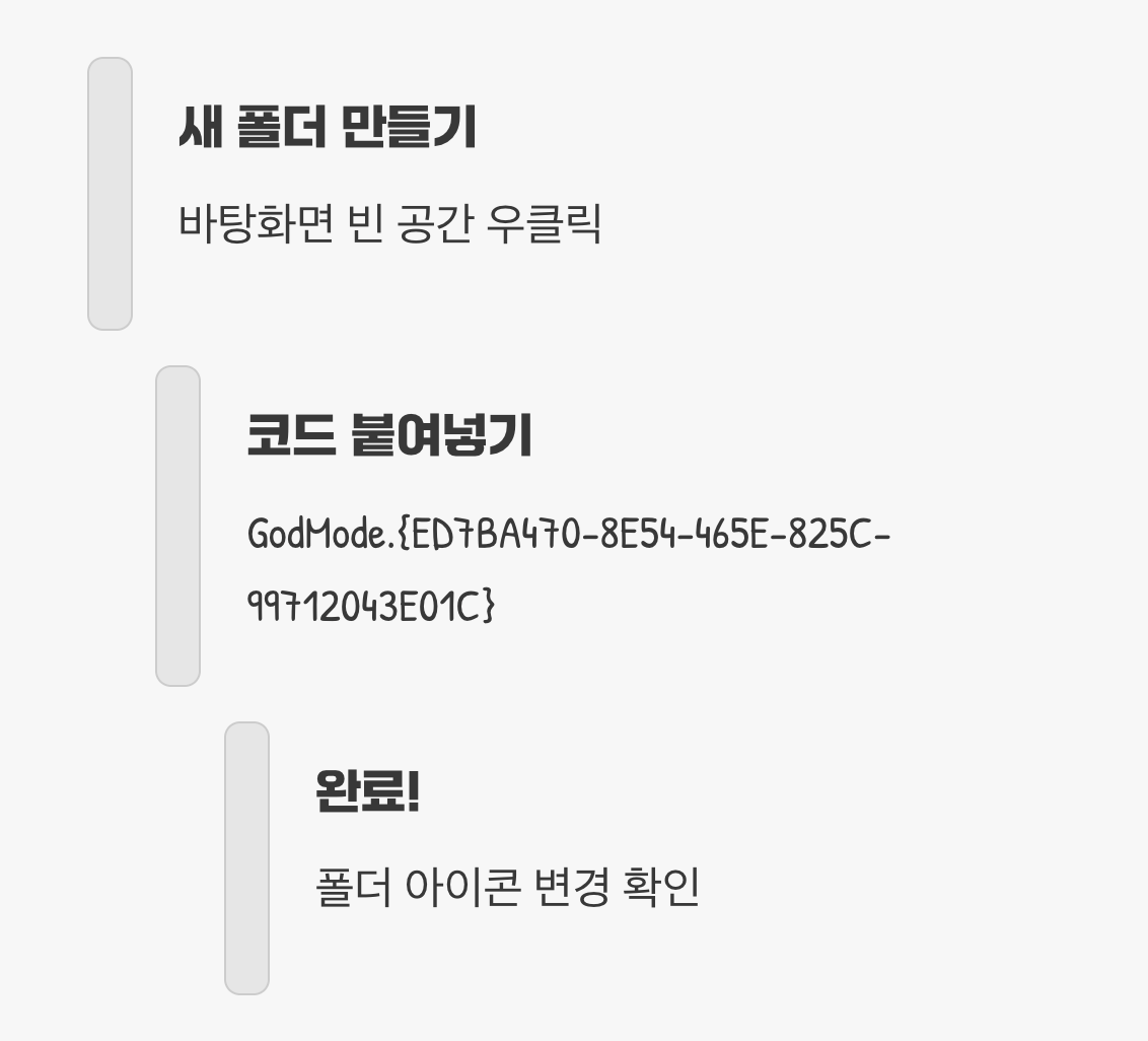바탕화면에서 새 폴더 생성 후 "GodMode.{ED7BA470-8E54-465E-825C-99712043E01C}"로 이름 변경하면 IT 전문가처럼 윈도우의 고급 설정을 한눈에 확인·관리할 수 있습니다. - 윈도우즈 갓모드. 모든 설정을 한 곳에서 확인하는 방법 - mpjamong.tistory.com