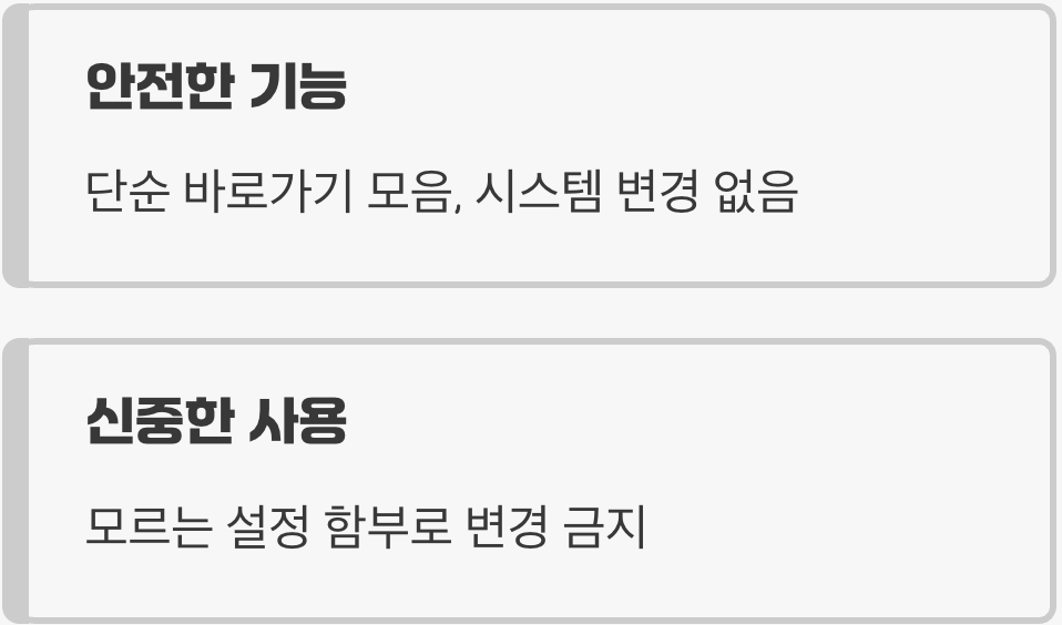 다만, 한 가지 기억해야 할 점은 이곳에서 제공하는 모든 설정은 실제 시스템을 변경하는 강력한 기능이라는 것입니다. 따라서 컴퓨터 초보자의 경우, 정확히 어떤 역할을 하는지 모르는 항목을 호기심에 함부로 변경하지 않도록 주의해야 합니다. 이 도구는 어디까지나 '편의성'을 위한 것이지, 시스템을 임의로 수정하기 위한 것이 아님을 명심하세요.
