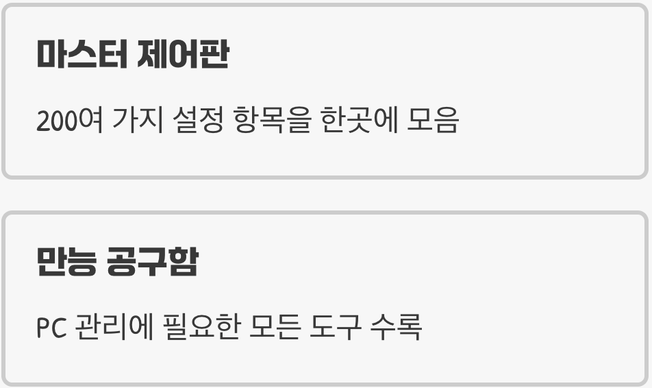 '갓모드'라는 거창한 이름 때문에 무언가 대단하고 위험한 기능이 아닐까 생각할 수 있지만, 사실 그 정체는 매우 간단합니다. 바로 윈도우에 흩어져 있는 200여 가지의 모든 설정 항목들을 하나의 폴더 안에 보기 좋게 모아놓은 '마스터 제어판'입니다.