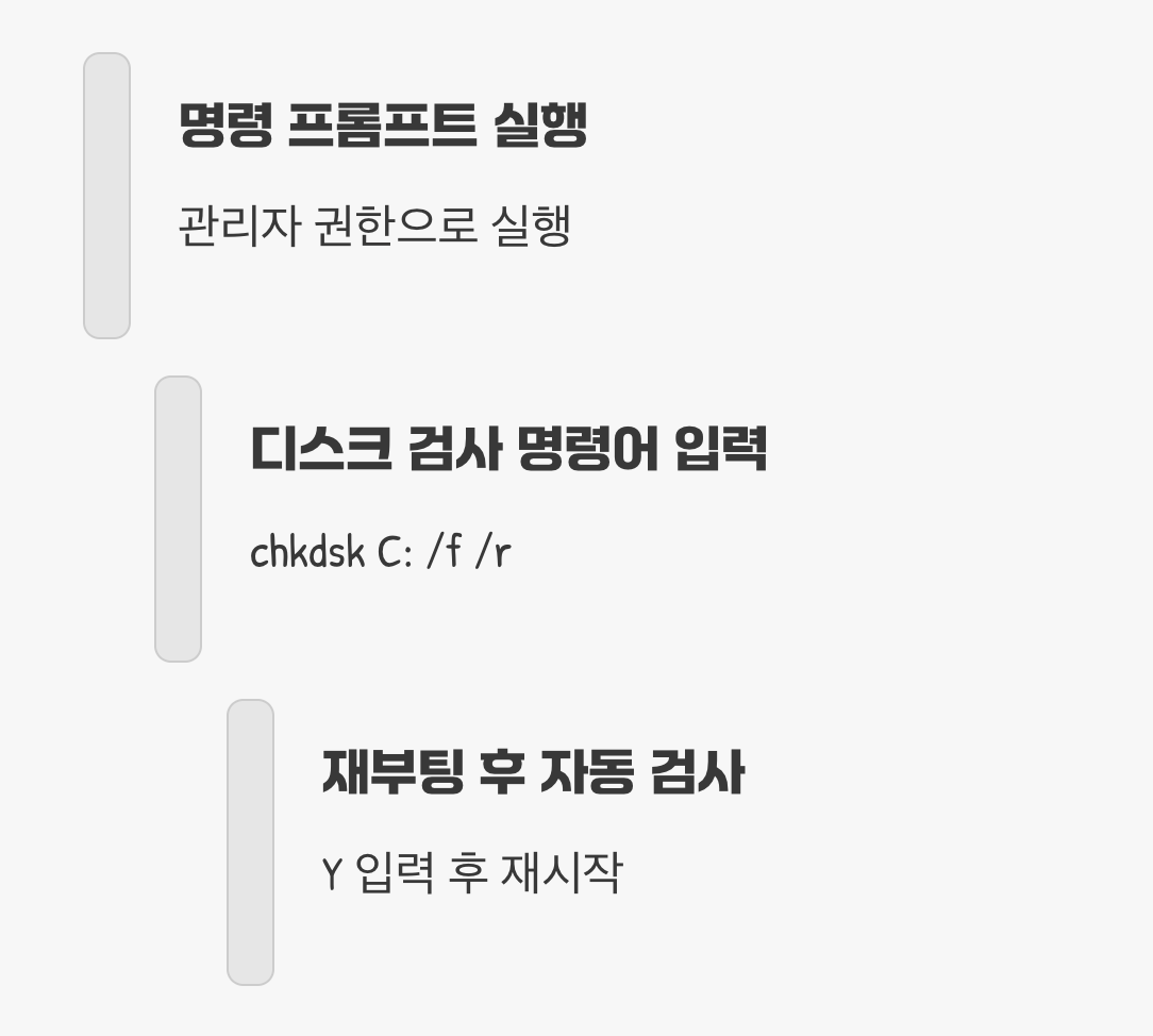 검사를 진행하려면, 작업 표시줄 검색창에 'cmd'를 입력한 후 '명령 프롬프트'에 마우스 오른쪽 버튼을 클릭해 '관리자 권한으로 실행'을 선택하세요. 검은 창이 나타나면 chkdsk C: /f /r 이라고 입력한 뒤 엔터 키를 누릅니다. (만약 윈도우가 설치된 드라이브가 C가 아니라면 해당 문자로 변경해야 합니다.) 시스템이 사용 중이므로 다음 부팅 시 검사를 예약하겠냐는 질문(Y/N)이 나오면 Y를 누르고 컴퓨터를 재시작하면, 부팅 과정에서 자동으로 디스크 검사가 진행됩니다.