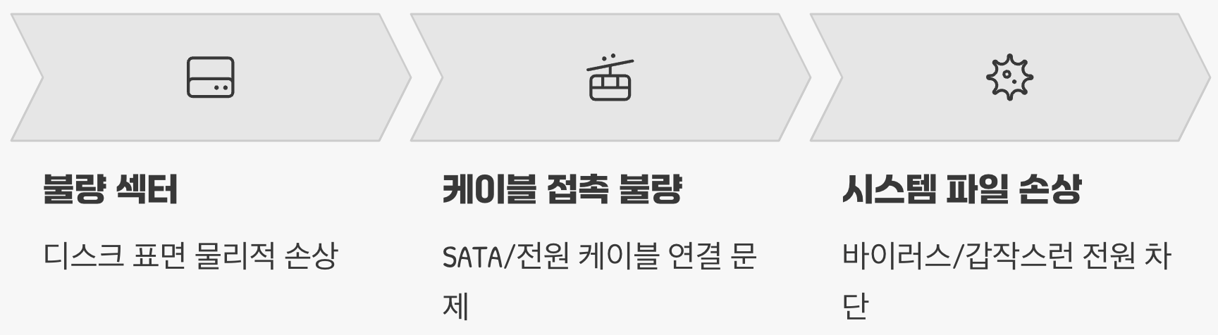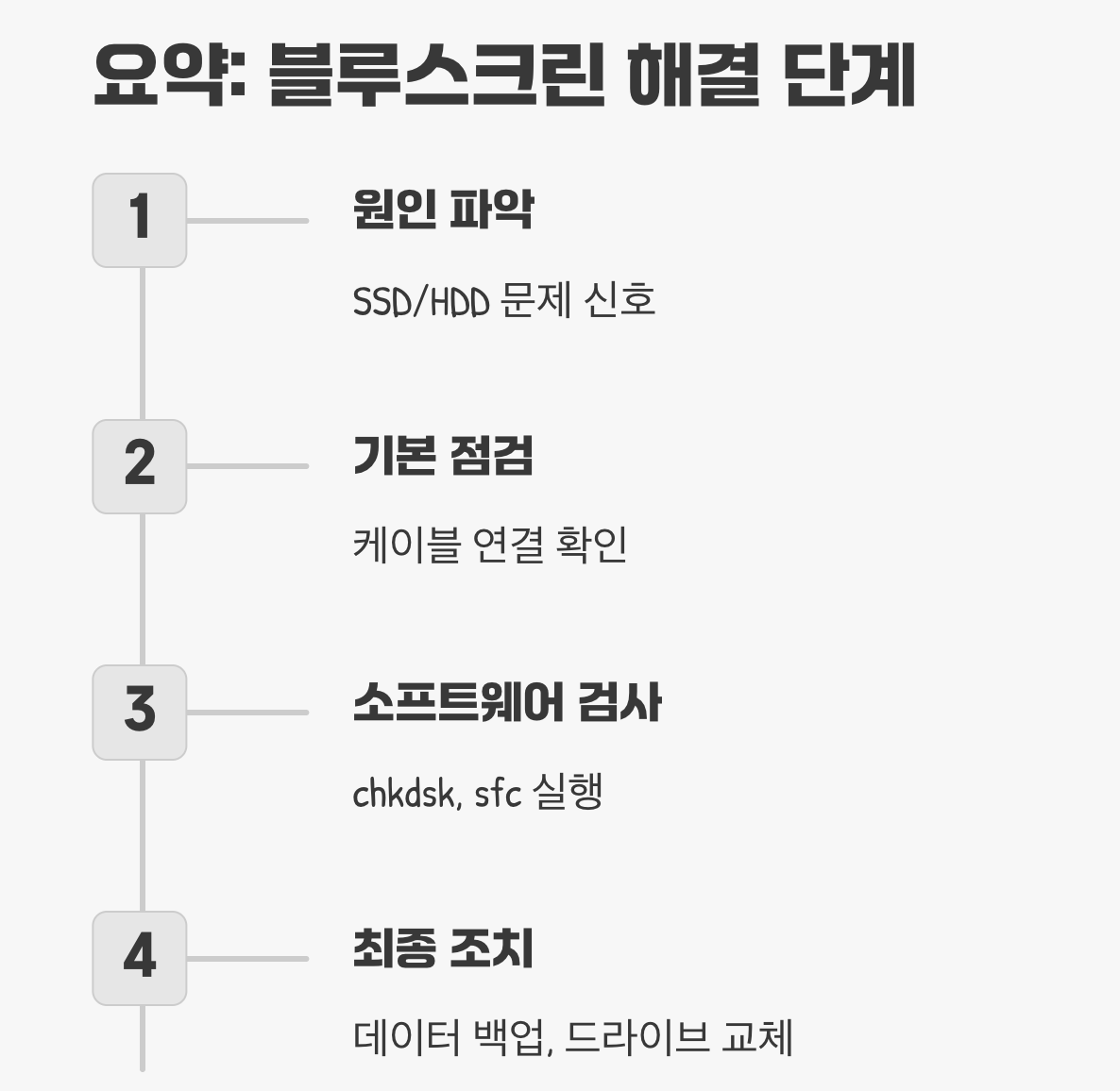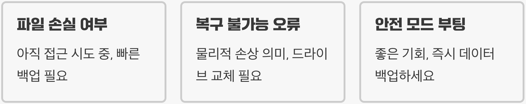 마지막으로는 바이러스 감염이나 갑작스러운 전원 차단 등으로 인해 윈도우 운영에 필수적인 시스템 파일 자체가 손상된 경우를 들 수 있습니다. 문제 해결을 위해서는 이처럼 물리적인 연결 문제부터 시작해 디스크의 논리적, 물리적 오류 순서로 차근차근 점검해 나가는 것이 효과적입니다.