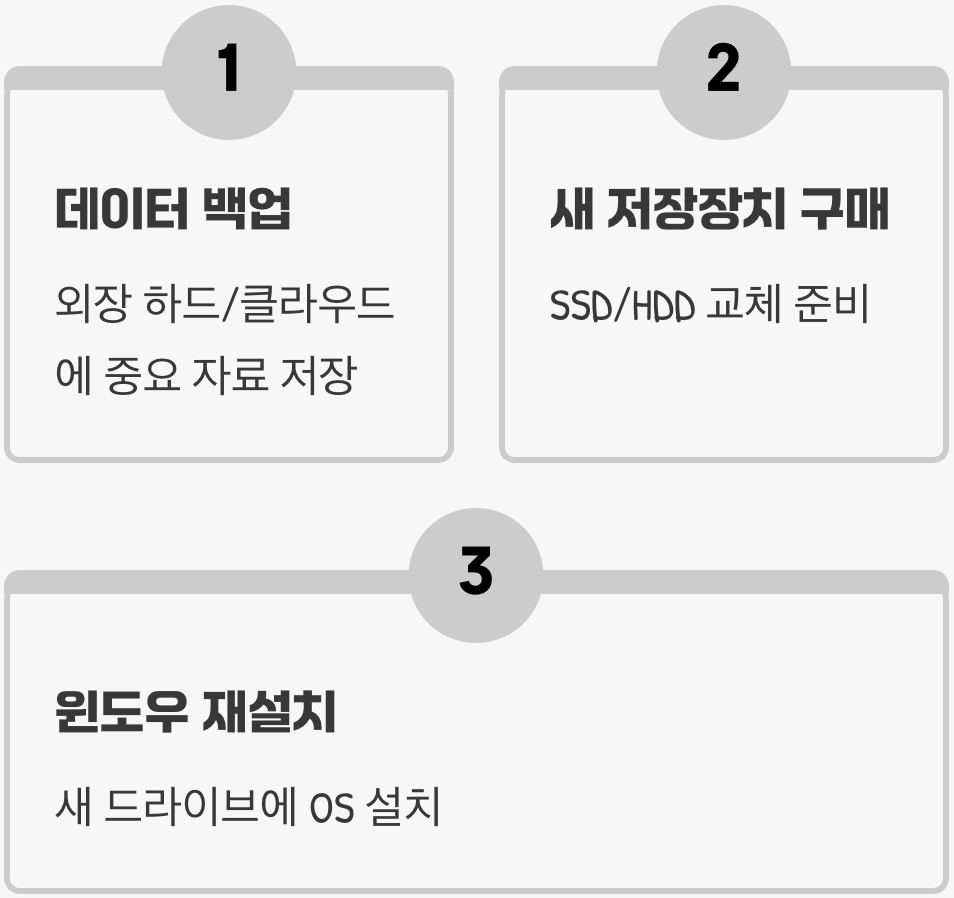가장 중요한 것은 더 이상 돌이킬 수 없는 상황이 오기 전에, 컴퓨터에 저장된 중요한 문서, 사진 등 개인 자료들을 외장 하드나 다른 PC, 클라우드 서비스 등에 즉시 백업하는 것입니다. 백업을 완료했다면, 새로운 SSD나 하드디스크로 교체하고 윈도우를 새로 설치하는 것이 유일하고 가장 확실한 해결책입니다.