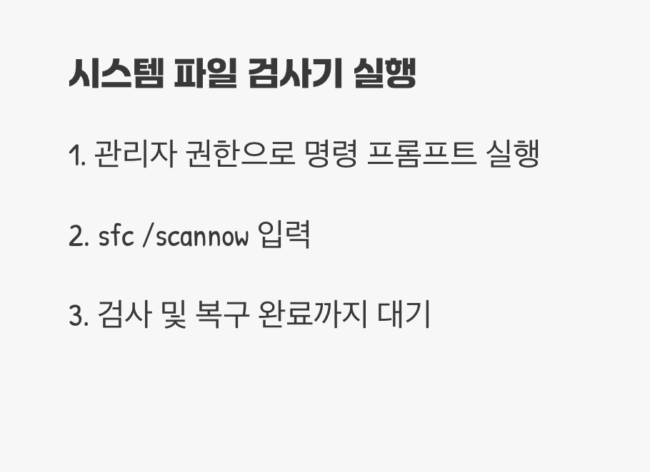 만약 디스크 검사를 마친 후에도 동일한 블루스크린이 나타난다면, 이번에는 손상된 시스템 파일을 의심해 볼 차례입니다. '시스템 파일 검사기'는 윈도우의 핵심 파일들이 원본과 동일한지 확인하고, 만약 변조되거나 손상된 파일이 있다면 정상 파일로 자동 복구해주는 아주 유용한 기능입니다.