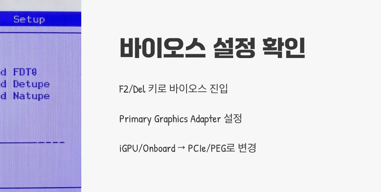 위의 모든 방법을 시도했음에도 문제가 해결되지 않는다면, 컴퓨터의 가장 기본적인 설정인 바이오스를 확인해 볼 필요가 있습니다. 간혹 메인보드의 바이오스가 내장 그래픽(CPU에 포함된 그래픽 기능)을 우선적으로 사용하도록 설정되어, 새로 장착한 외장 그래픽카드를 인식하지 못하는 경우가 있습니다.