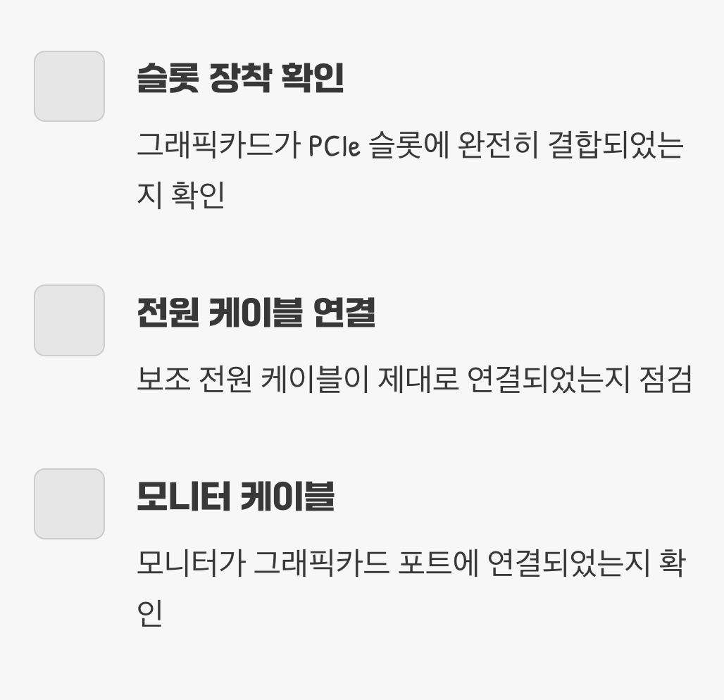A. 이 경우는 하드웨어 문제일 가능성이 높습니다. 가장 먼저 그래픽카드가 슬롯에 제대로 장착되었는지, 보조 전원 케이블이 잘 꽂혔는지 다시 한번 확인해 보세요. 케이블이나 모니터의 다른 포트에 연결해 보는 것도 방법입니다. 그래도 해결되지 않는다면, 그래픽카드 자체의 초기 불량일 수 있으므로 구매처에 문의해야 합니다.